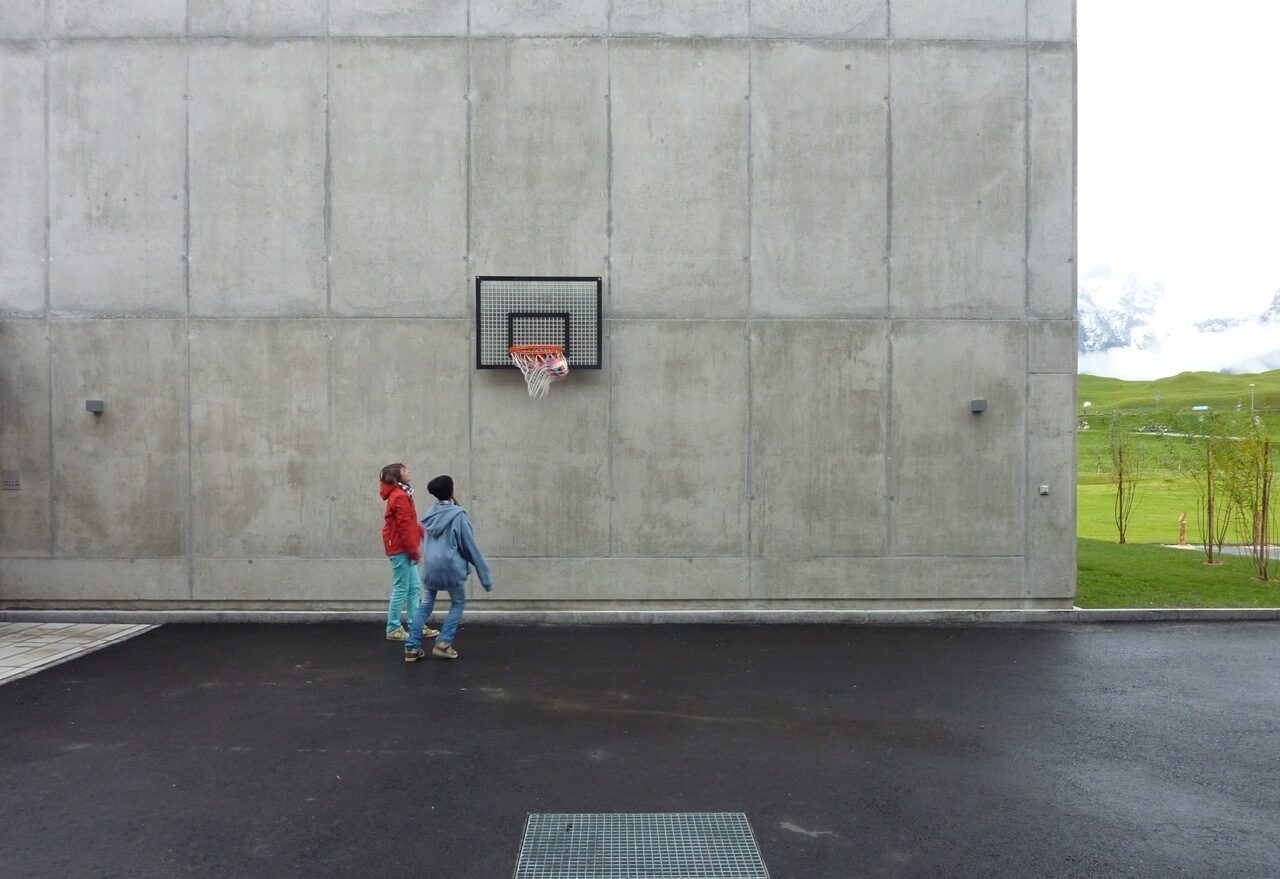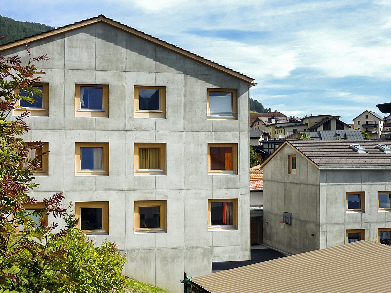 Die grosszügige Waschküche mit ihrem Fenster auf den Platz kann auch als Mehrzweckraum genutzt werden. Der pragmatische Umgang mit dem Raum erinnert an einen traditionellen Dorfplatz. Die Rahmen der Holzfenster in der „ausgestanzten“ Sichtbetonfassade sind unterschiedlich breit und lockern das strenge Raster auf. Im Wohnraum sind die Fenster über Eck angeordnet und lassen die Engadiner Stube aufleben. Der Bau an der Strasse ist als Reihenhaus organisiert. Maisonettewohnungen reichen bis unter den Dachstuhl. Im hinteren Haus sind Studios flexibel der einen oder anderen Wohnung zuschaltbar.