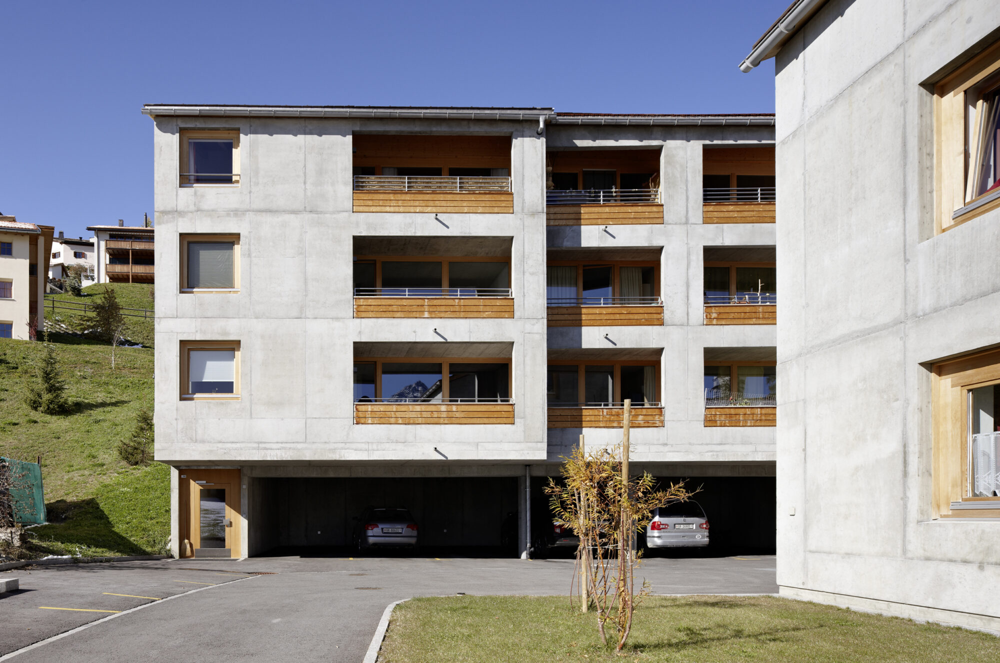 Sechs Architekturbüros aus der Region wurden zu einem Wettbewerb eingeladen, Urs Padrun aus Guarda gewann ihn. Er teilte 13 Wohnungen auf zwei gegeneinander verdrehte Volumen auf.