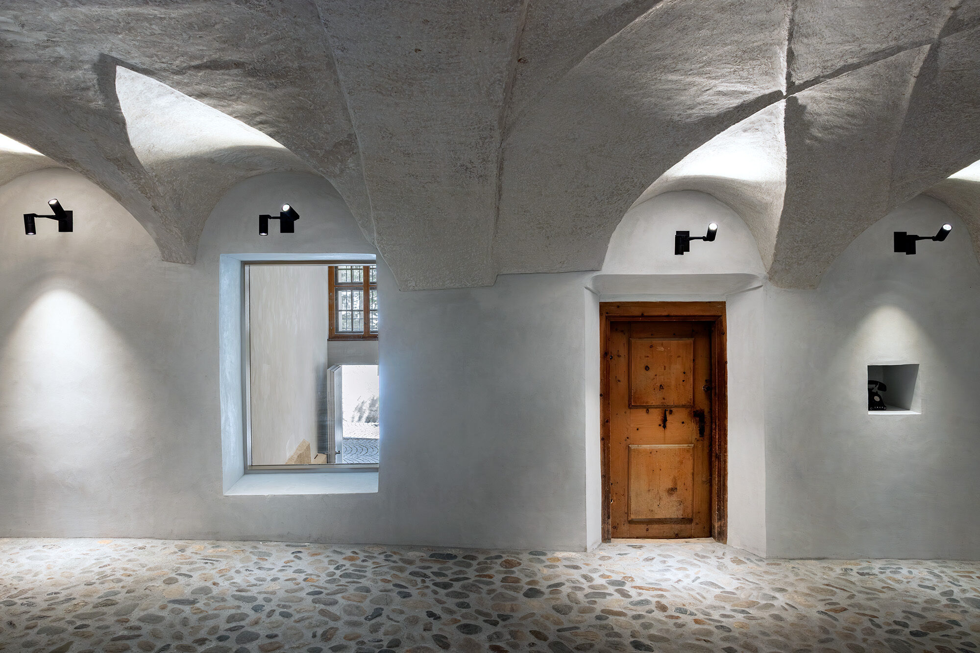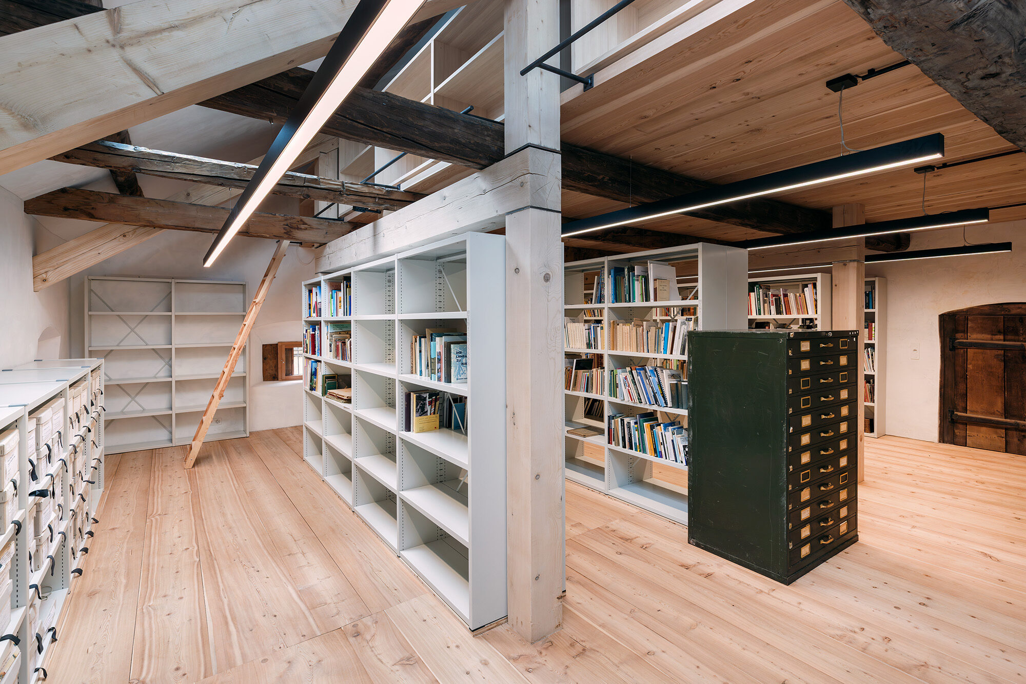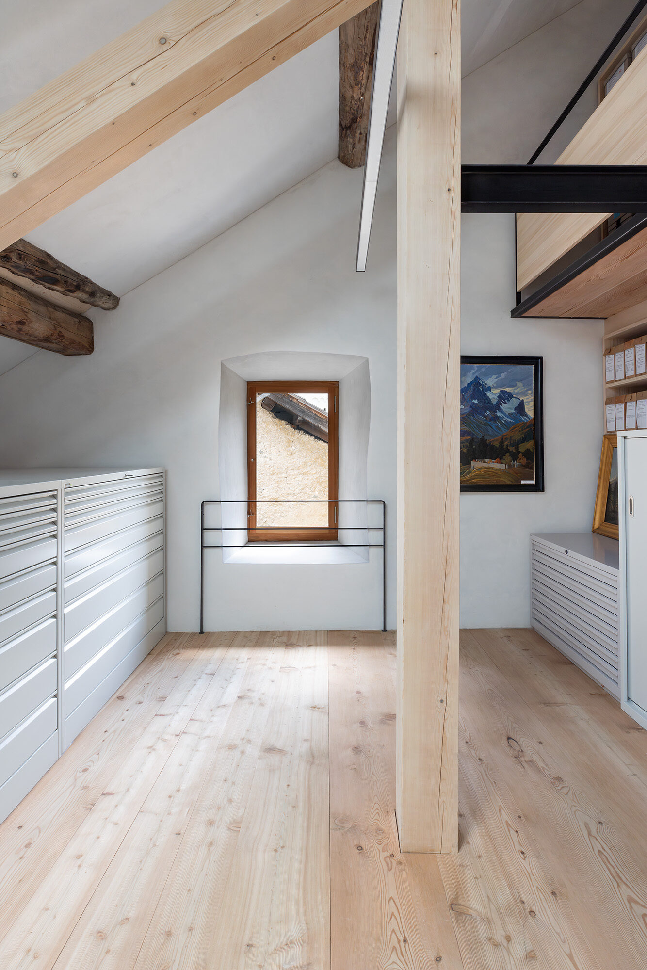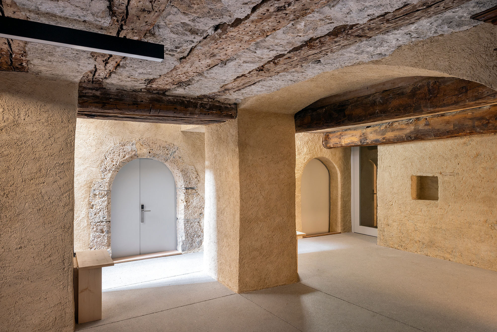 Die Materialien der Ergänzungen und neuen Einbauten bestehen vorwiegend aus unverleimten Naturhölzern aus der Region. Die Kalkputze sind Eigenmischungen der Restauratoren.